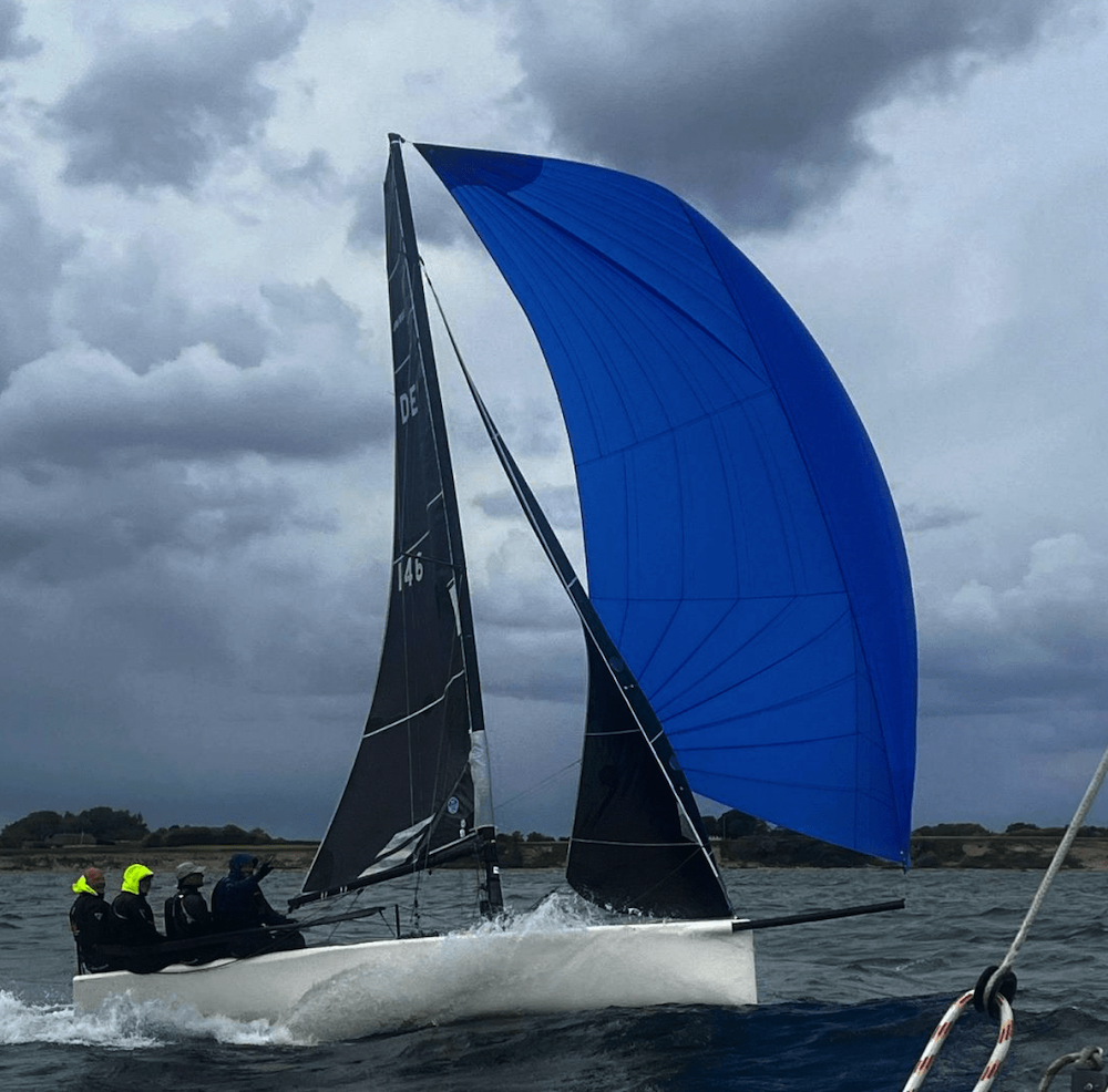 Fortsat spiler videre op mod kobberdybet. Kort før kobberdybet kom endnu en kraftig byge, som overraskede os (det var blevet mørk og vi var nok lidt for trætte og uopmærksomme). Da vi ved en fejl fik slækket spilerfaldet i stedet for Kickeren, fik vi lov til at arbejde lidt ekstra for at få styr på tingene igen. Ned med den store spiler og op med skæringsspiler (og så faldt vinden selvfølgelig igen), to bomninger ind gennem Kobberdybet og så spilerskift til den store igen og videre på skæring op mod Storebæltsbroen med en ret konstant fart på 11-12 knob. Spiler ned ved broen og foran for tværs inden om Romsø i jagten på strømlæ. Her kom den næste XR 41 udenom. Bølgelæ fra Romsø op mod Fyns Hoved gav mulighed for lidt mere mad og at få samlet lidt kræfter til det sidste kryds over til Æbelø. Vi rundede Fyns Hoved da det blev lyst, og slog med det samme ind under Fyn – både for at finde bølge- og strømlæ, men også fordi vejrmeldingen sagde at vinden skulle dreje syd i. Vinddrejningen kom aldrig helt, men der var store vindspring at slå på, så det lykkedes os at komme til Æbelø på ”kun” fire timer. Herefter ca. en time på bidevind ind mod mållinjen der blev krydset lidt før kl. 9 lørdag morgen.