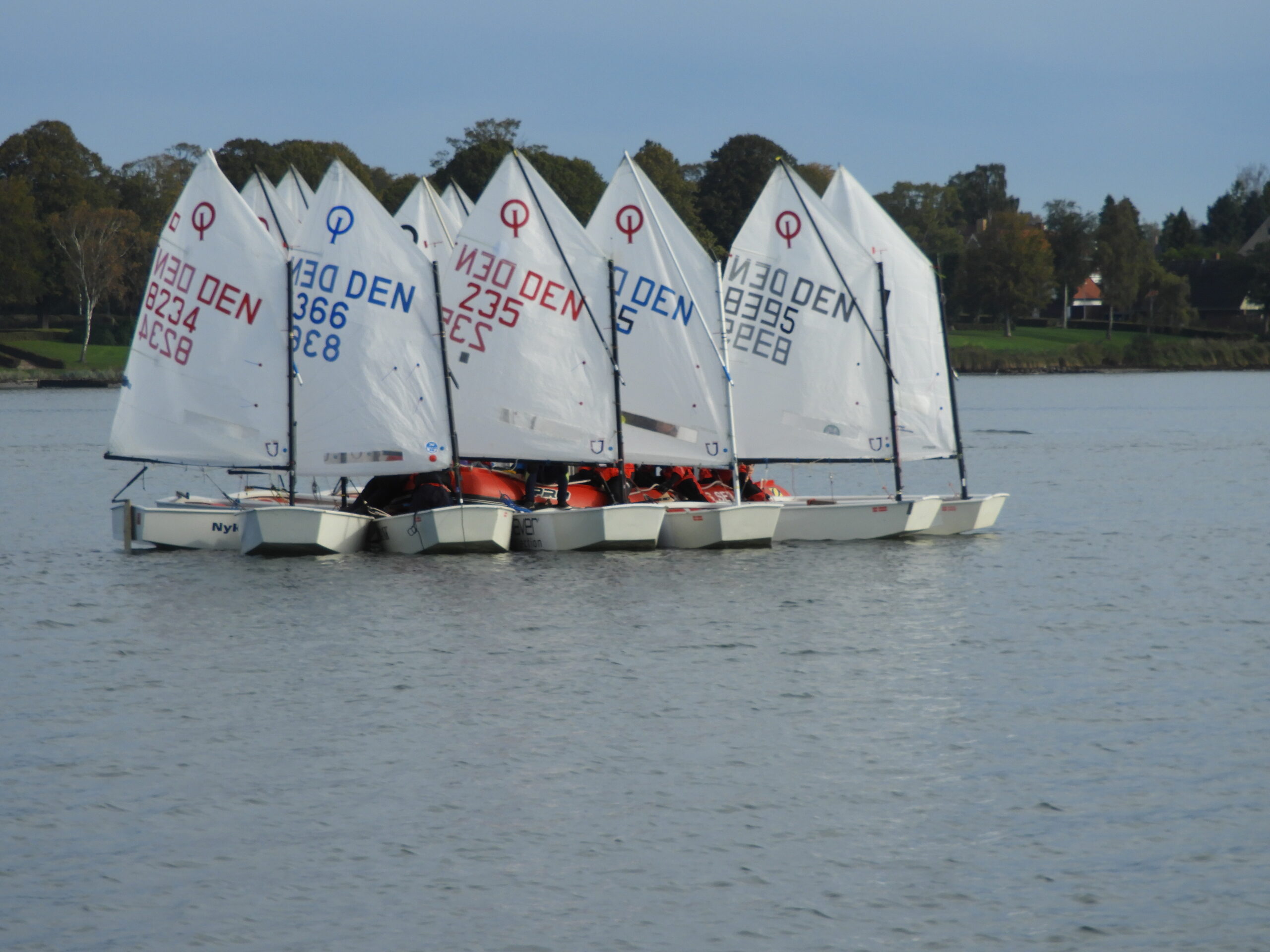 27 optimistjoller med børn i alderen 7 – 13 år sejlede på fjorden klar til kapsejlads, de manglede bare vinden, mere om det senere.
